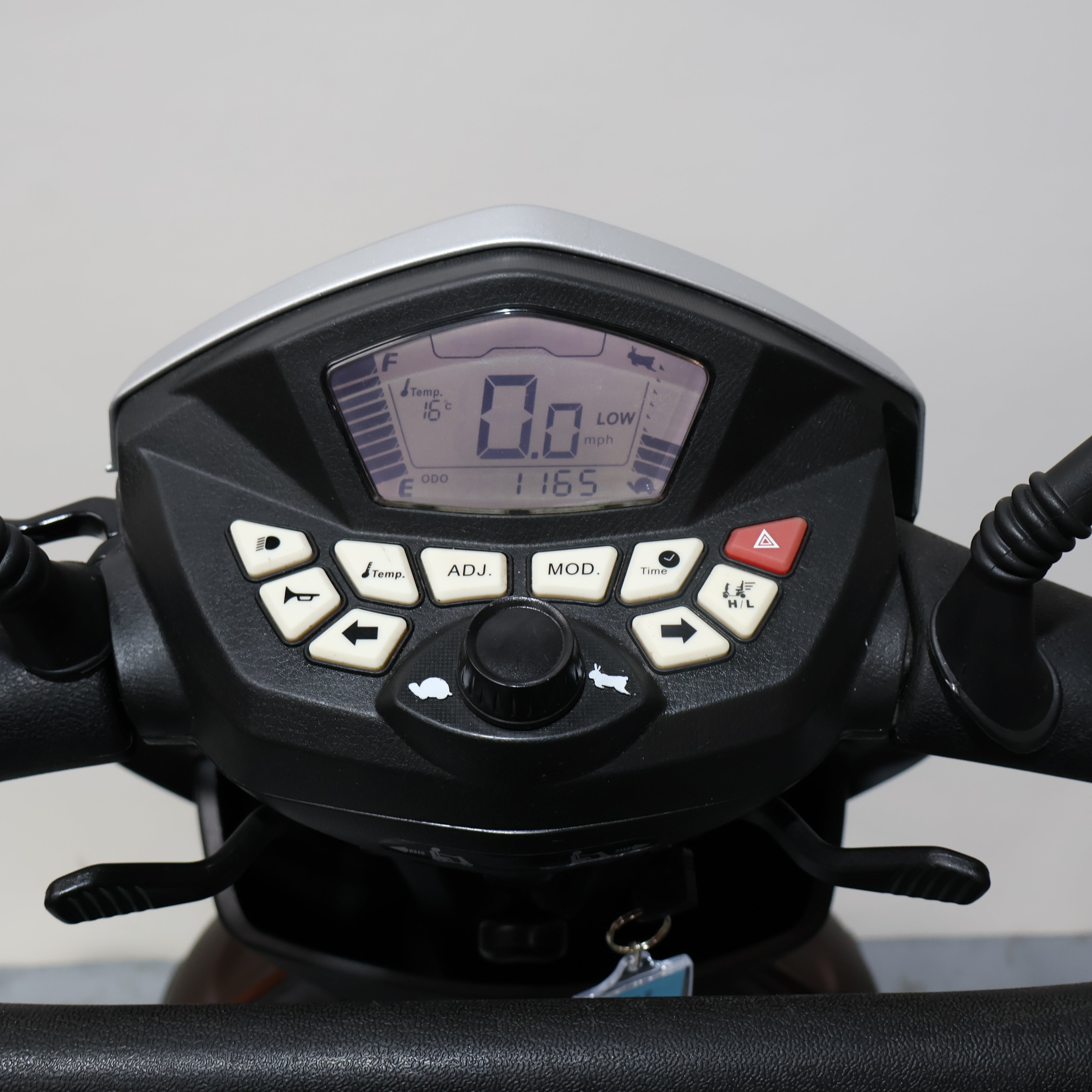 The standard tiller configuration has been superseded by a comfortable delta tiller bar. A bright, back-lit display taken straight from motorcycle design ensures you can always see vital information and is also waterproofed against the elements. To keep pace with the modern world we live in, Kymco mobility scooters have even provided a 12 volt socket to charge your mobile phone or tablet on the move. Powerful all round LED lighting ensures you can see and be seen. The lights are low power LED's that use a fraction of the power that normal bulbs do, leaving more power for your journey on your Kymco Agility mobility scooter.